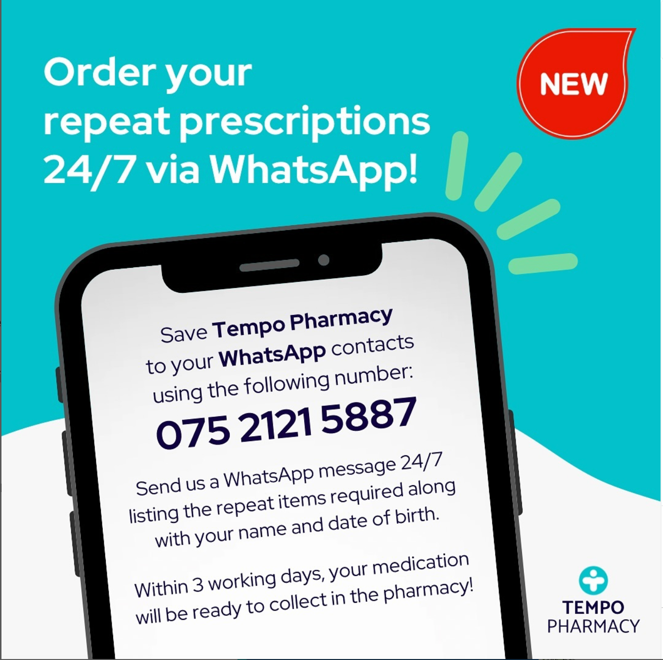 At Tempo Pharmacy, we’re making it easier than ever to stay on top of your health. You can now order your repeat prescriptions anytime, anywhere using WhatsApp!